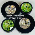 The plug shown in the main photo is 1 1/4" (32mm). The gem size is 27mm, and will stay the same size on all plugs. If you would like this gem in a different wood, please click here and let us know what wood you would like.